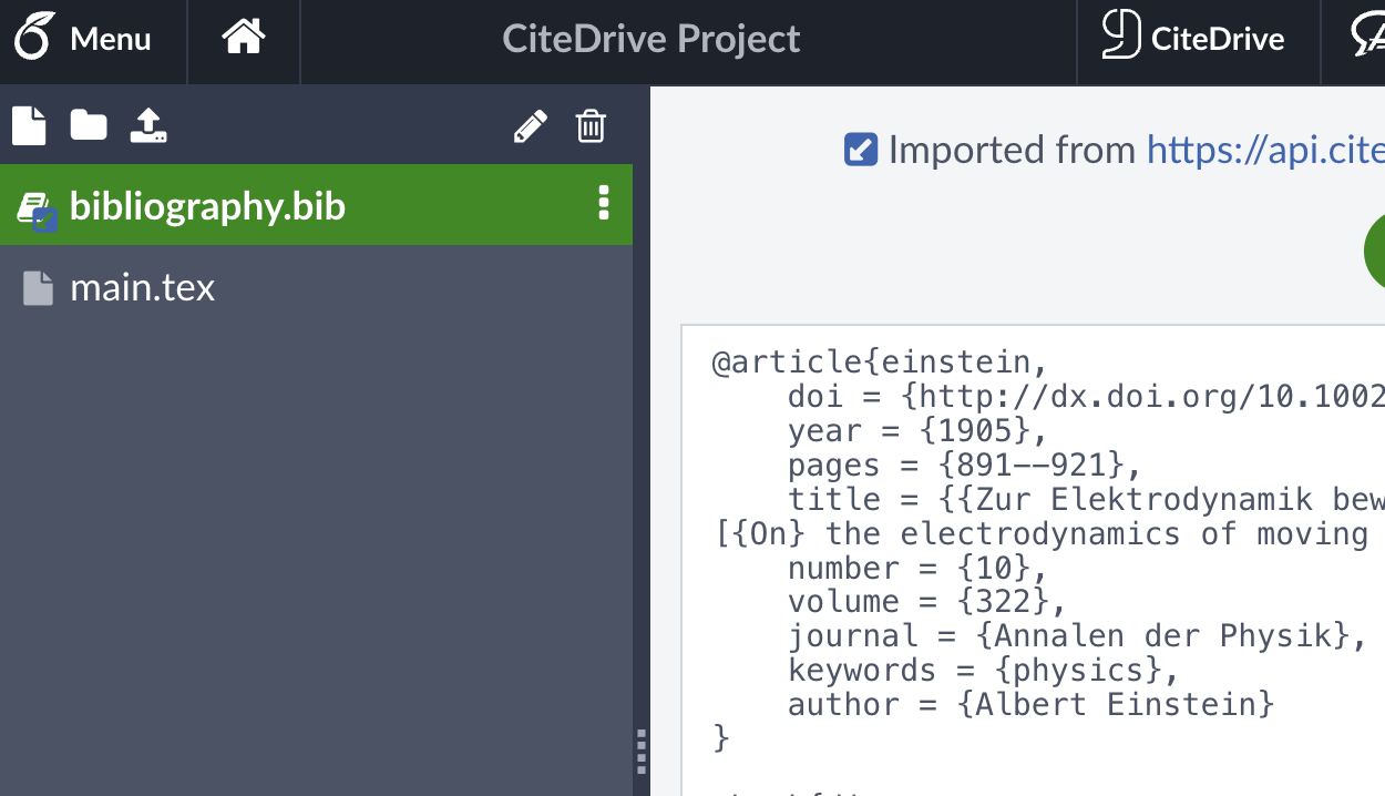 Once you’ve linked your CiteDrive and Overleaf projects, we’ll next want to prepare our paper to include a bibliography. Open your main.tex file and add two tags near the top of the file.