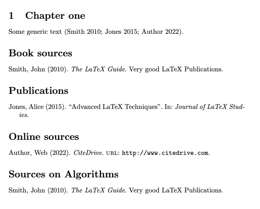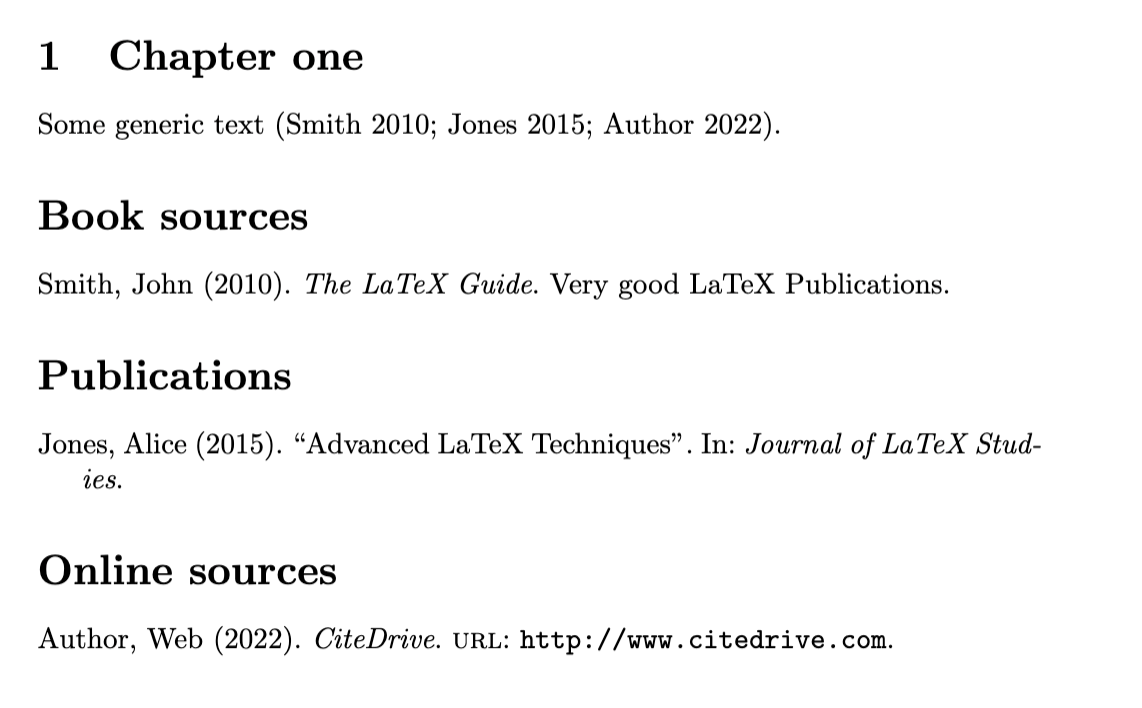 @online{website2022, author = {Web Author}, title = {CiteDrive}, year = {2022}, url = {http://www.citedrive.com},}In your LaTeX document, use the \printbibliography command with the type option to filter entries based on their types. For example: